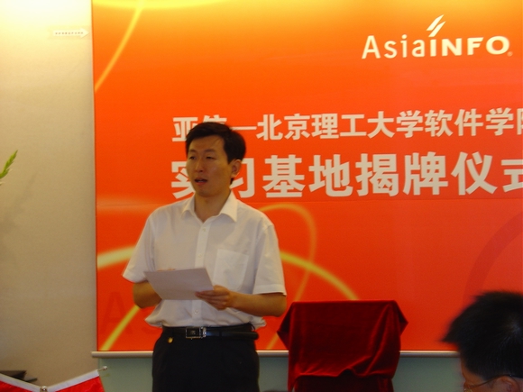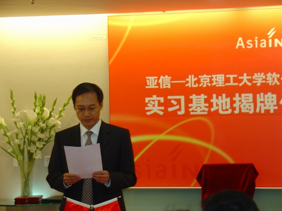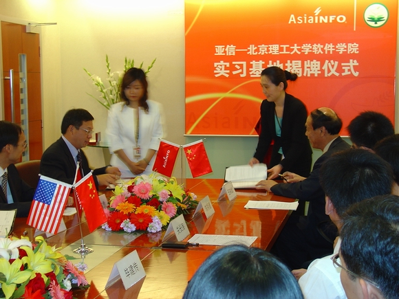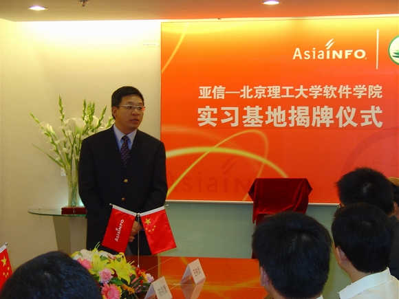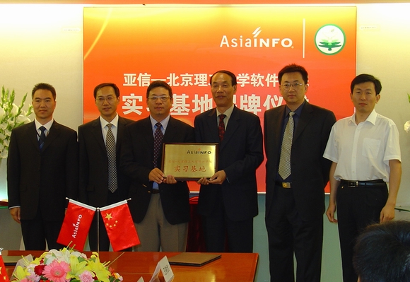2007年5月16日,亚信-beat365中文官方网站软件学院实习基地揭牌仪式在亚信集团公司隆重举行,参加揭牌仪式的有软件学院书记王树武教授、副院长陈朔鹰副教授、行政办公室对外合作部刘昕戈老师、林婷老师;亚信集团公司首席执行官兼总裁张振清先生、人力资源及行政部总经理张寅虎先生、人力资源规划及招聘经理陈沁女士、研发部总经理刘丰先生、北方质量控制中心总监吴晓洁女士、研发中心研发总监许颖先生;高校毕业生就业促进会秘书长关长海先生、会员服务与俱乐部毕建传先生。仪式由市场推广部经理张小芊主持。