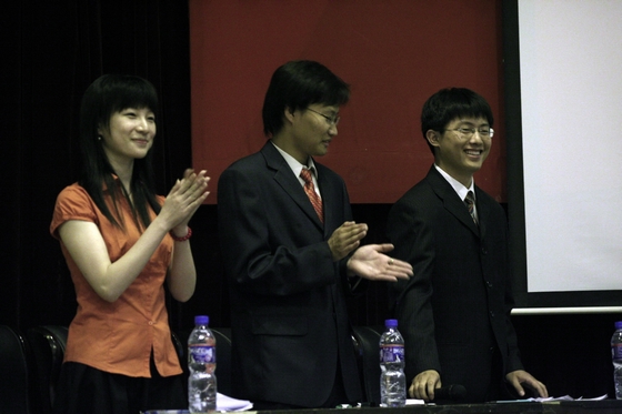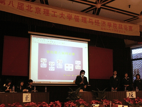 决赛之前,大赛组织者精心安排了一场三人制表演赛,表演赛的正反双方分别是beat365管理与经济学院的明星辩论队和北京交通大学国际大专辩论赛成员队。我院明星队的成员包括前学院学生会主席孟祥鹏、校京工演讲团团长线朝华、学院上届优秀辩手王未佳同学。他们的辩题是:正方——“钉子户”事件有利于大众维权;反方——“钉子户”事件不利于大众维权。双方围绕这个辩题一番唇枪舌战,虽然双方激烈异常,但是幽默与风趣的辩风、酣畅淋漓的陈词却给这场表演赛带了独特的感觉视听享受。