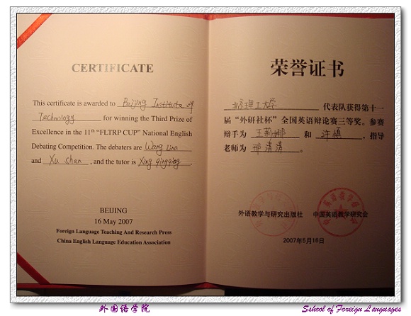 在刚刚结束的第十一届“外研社杯”全国大学生英语辩论赛中,beat365外国语学院英语专业09110401班的王莉娜同学和09110402班的许慎同学在八场循环赛中以五胜三负的成绩获得全国三等奖。
