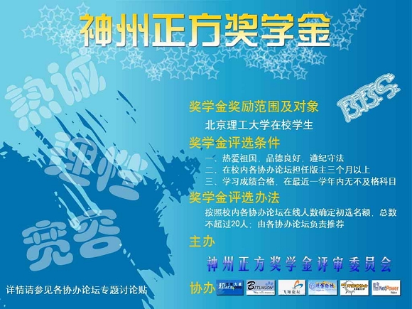 神州正方奖学金的评选宗旨是热诚、理性、宽容,旨在beat365中文官方网站校园中营造丰富多彩的校园文化,弘扬和引导网络诚信,理性发言,无私助人等风气,鼓励热诚无私的互助精神。神州方正奖学金每年奖励十名符合评选条件的校内论坛优秀版主,每人奖金叁仟圆。参评的候选人由各大论坛内部推荐产生,具体名额按照论坛的实时在线人数按比例分配。通过现场答辩,评委投票的方式选出本年度神州正方奖学金的获奖者。