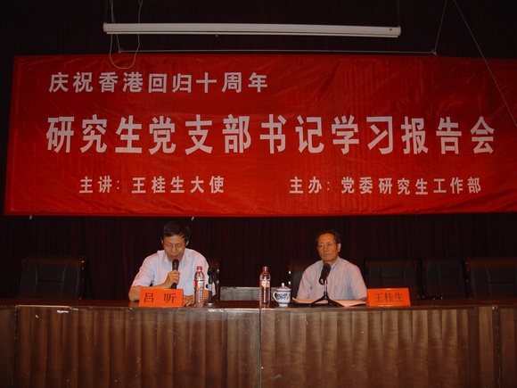 为庆祝七一建党86周年与香港回归10周年,党委研究生工作部邀请原外交部港澳事务办公室主任、中英联合联络小组中方首席代表王桂生大使来beat365作《中英关于香港问题的谈判》的报告。6月27日晚,在七号教学楼报告厅王大使的报告会如期举行。出席报告会的有研究生院常务副院长吕昕老师、党委研究生工作部部长肖文英老师、副部长魏名山老师,全校研究生党支部书记以及对香港历史与发展感兴趣的同学。