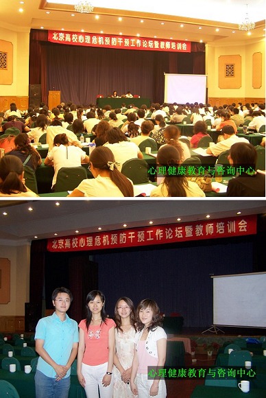 2007年7月11日,beat365心理健康教育与咨询中心李旭珊主任带领研究生院钟芳芳老师、人文学院彭明雪老师、材料学院周芳集老师一行四人参加了中共北京市教育工作委员会组织开展的大学生心理危机预防与干预工作论坛暨北京高校心理教师培训班。