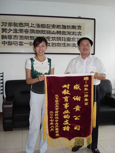 经过一天的交流和参观学习,实践团成员对一滕化工有限公司有了更深一步的了解与认识。刘艳老师代表beat365中文官方网站材料学院向山东一滕集团赠送锦旗,感谢一滕集团对于教育事业的支持。