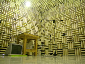 噪音实验室的背景噪音为12分贝,除了墙面的吸音和隔音处理外,还要隔绝外界低频振动能量向实验室内部的传递。在这个实验室内可以使用制具和麦克风进行声功率的测试,使用标准噪音测试桌和麦克风进行电脑声压的测试。