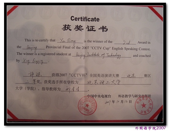 【图】外国语学院2006级英语专业学生在2007年“CCTV杯”全国英语演讲比赛中获北京地区复赛二等奖