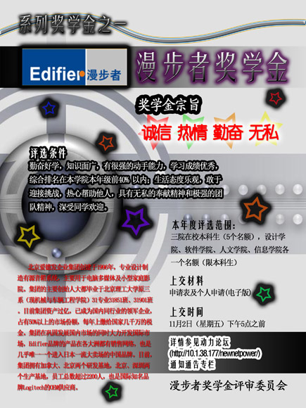 漫步者奖学金评审委员会负责奖学金的管理、评审和发放,本年度的报名工作正在进行,机械与车辆工程学院的学生可以将电子版申请自述发给年级辅导员,其他学院的学生由所在学院的学生工作组推荐后发邮件至wangtaipeng1985@163.com。