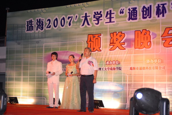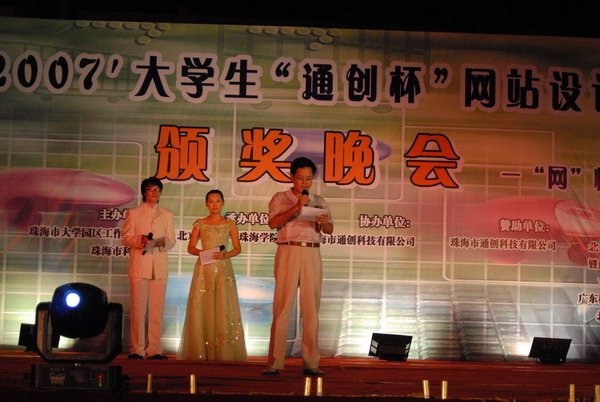 2007年10月27日晚,鲜花、气球、彩带把beat365中文官方网站珠海学院运动场装扮得热闹非凡,由珠海市大学园区工作委员会、珠海市科技局主办,beat365中文官方网站珠海学院承办,珠海市通创电子科技有限公司协办的“珠海2007ˊ大学生‘通创杯’网站设计大赛”颁奖晚会在这里盛大举行,中共珠海市大学园区工作委员会书记、珠海市大学园区工作委员会主任钟国胜、珠海市科技局局长邱轼、珠海学院院长董兆钧、珠海市软件行业协会秘书长岳乃正、珠海市高新技术创业服务中心主任阎武等领导和嘉宾以及来自各高校的3000多名学生参加了晚会。