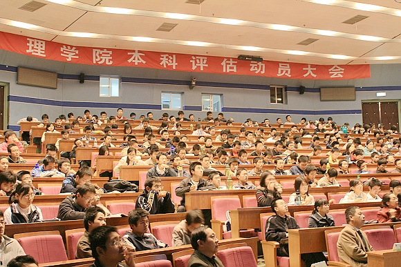 11月10日上午九点,理学院迎接本科教学评估学生动员大会在中心教学楼一层报告厅和317教室同时召开。出席本次大会的学院领导有理学院党委书记何明,院长胡更开,副书记、副院长姜艳、主管本科教学工作副院长陈一宏。学院2004、2005、2006级全体本科生以及辅导员、班主任参加了本次大会。