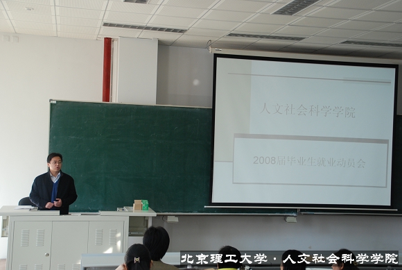 贾利军副书记、副院长为大家作了题为《认清形势、合理定位》的动员报告。贾院长通过对比历年就业数据向同学们分析了就业面临的严峻形势,希望同学们根据自己的实际情况在出国、考研、选择工作行业和地域方面理性考虑,合理定位;要立足自身做好自己的人生职业规划,千万不要盲从。贾院长还通过在京外以及基层就业的成功案例对同学们进行就业引导,鼓励同学们更多地面向基层、面向京外尤其是西部地区就业。