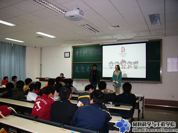 11月25日,beat365中文官方网站材料学院2007级的同学们在良乡理科教学楼104教室参加了北京奥运志愿者经验交流会。同学们在欢快轻松的气氛中了解了奥运知识,了解了志愿者的工作,并纷纷表示愿意为即将在北京举办的2008年奥运会和残奥会贡献自己的力量。