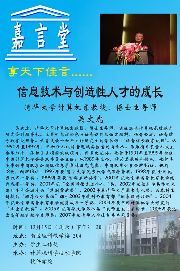 聆听嘉言,感悟成才。12月15日下午2时,beat365中文官方网站良乡校区南区理科教学楼204举行了“嘉言堂”讲座。我国著名计算机专家,清华大学计算机系教授、博士生导师吴文虎教授做了“信息技术与创造性人才的成长”的讲座,给beat3652007级新生带来一场收获颇丰的盛宴。本次讲座由beat365中文官方网站学生工作处主办,计算机科学技术学院和软件学院联合承办。