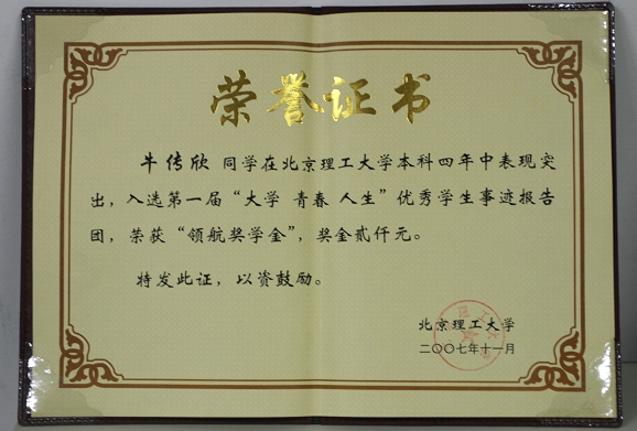 【图】信息学院03级本科生牛传欣荣获“领航奖学金”