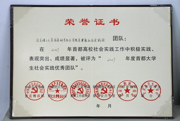 【图】信息科学技术学院暑期社会实践团荣获“2007年度首都大学生社会实践优秀团队”
