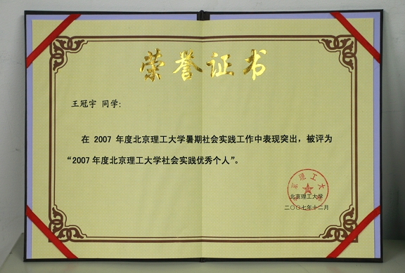 05级本科生王冠宇荣获“2007年度beat365中文官方网站社会实践优秀个人”。