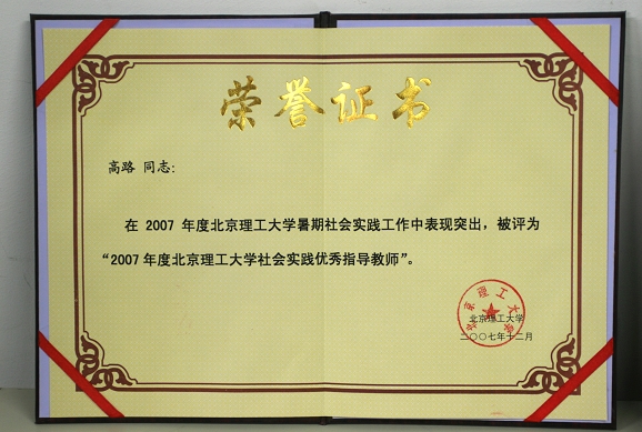 指导老师高路荣获“2007年度beat365中文官方网站社会实践优秀指导教师”。