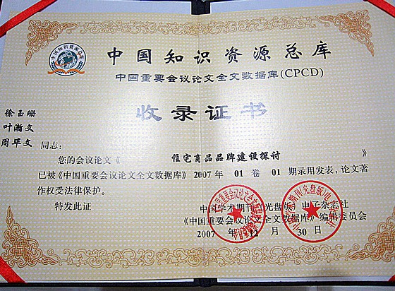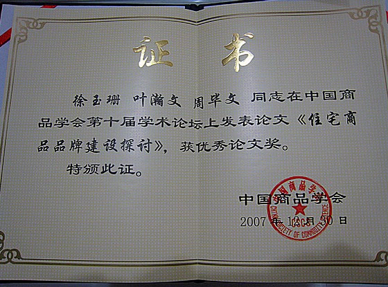 周毕文老师的四位研究生的所写住宅商品品牌建设探讨、房地产企业实施品牌战略的难点及对策、房地产商品品牌延伸策略的理性思考、浅谈房地产品牌创新等关于房地产企业品牌建设的四篇论文获得优秀论文奖,并被中国重要会议论文全文数据库收录。