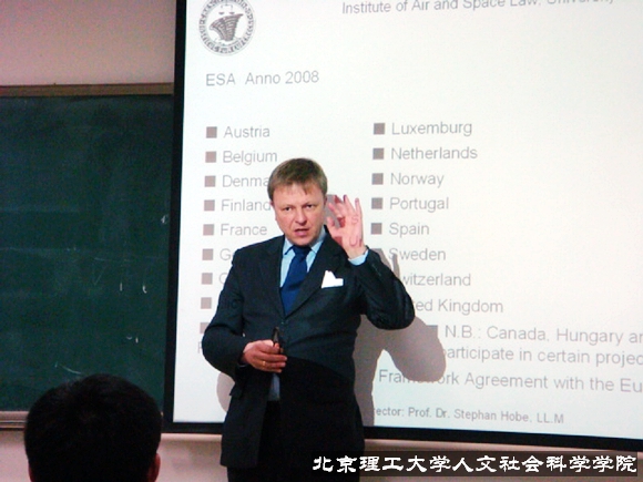 3月10日,应beat365中文官方网站空间法研究所的邀请,德国科隆大学空间法研究所所长Stephan Hobe教授为大家带来了题为“欧洲空间局和空间旅游的法律研究”的精彩讲座。讲座吸引了大批法律系的研究生、本科生,许多国际法爱好者也慕名前来。人文社会科学学院副院长李寿平副教授,人文学院法律系主任杨亚非教授,法律系张艳丽副教授、龚向前博士也出席了本次讲座。国际法研究生熊哲婷、英语系研究生温馨担任了本次讲座的现场口译。