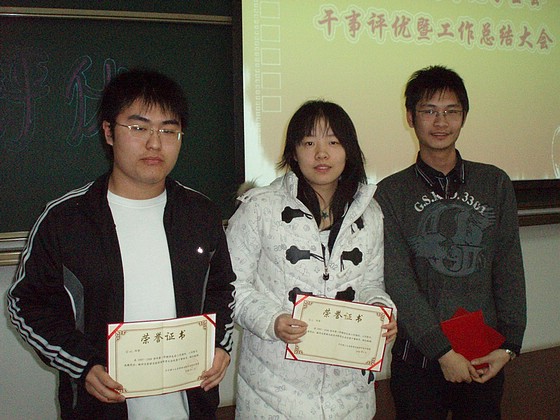 优秀干事颁奖并与他们合影留念,虽然他们拿到的只是一本简单的荣誉证书,但是其中蕴含着他们为学生会所付出的辛劳,同时这证书也是大家对他们的认同与鼓励。他们明白照片所记载的荣誉已成为过去,他们需要共同努力,通过去年的工作取其精华去其糟粕,再创新的佳绩。