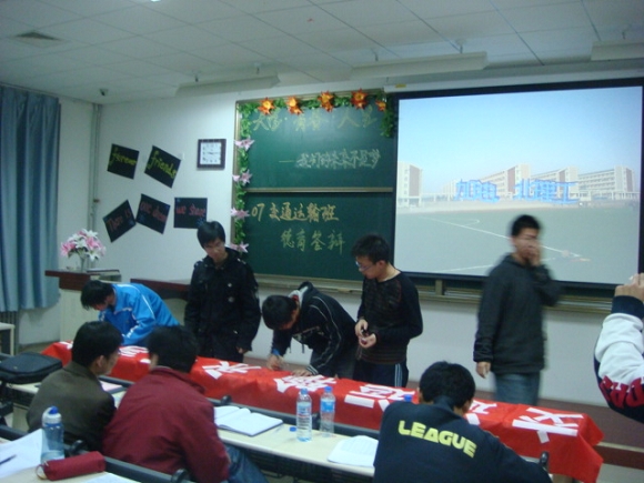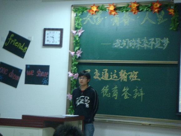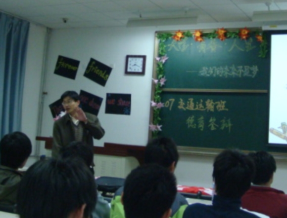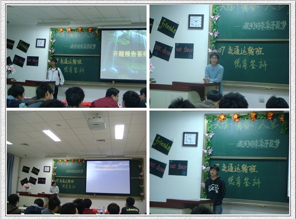 2008年3月26日晚七点,机械与车辆工程学院交通运输专业03420701班在良乡校区理科教学楼109教室举行了主题为“大学、青春、人生——我们的未来不是梦”德育答辩开题报告会。