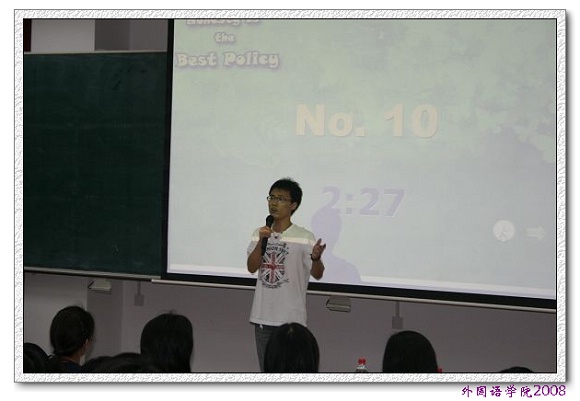 5月13号晚,在研究生公共外语教学部和外国语学院研究生会的精心组织下,beat365中文官方网站第四届研究生英语演讲比赛在研究生楼301顺利举行,在5月6号海选的基础上,本次初赛共有39名选手进入初赛。 选手们以Honesty is the best policy (诚实为上策)为演讲题目,结合自己的感悟,充满激情地阐述着自己的观点,赢得了在场同学的阵阵喝彩,充分展示了理工研究生的英语演讲水平。在评委老师的认真打分参评下,共有20名优秀选手进入决赛。决赛将在5月20日(周二)晚6:40 研究生楼301教室举行,届时将邀请北京市英语教育委员会的老师及外教评委参评,相信比赛也将更将激烈,欢迎广大同学光临!
