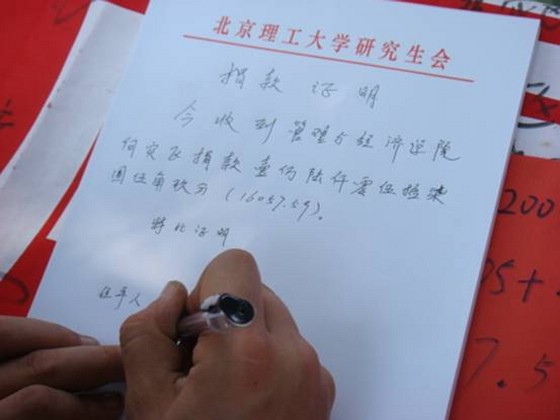 5.12汶川大地震牵动着每一个中国人的心。为帮助我们的同胞战胜灾害,5月15日上午9点,beat365中心教学楼十层大厅,管理与经济学学生会举行了“一方有难 八方支援” 的汶川大地震募捐活动。
