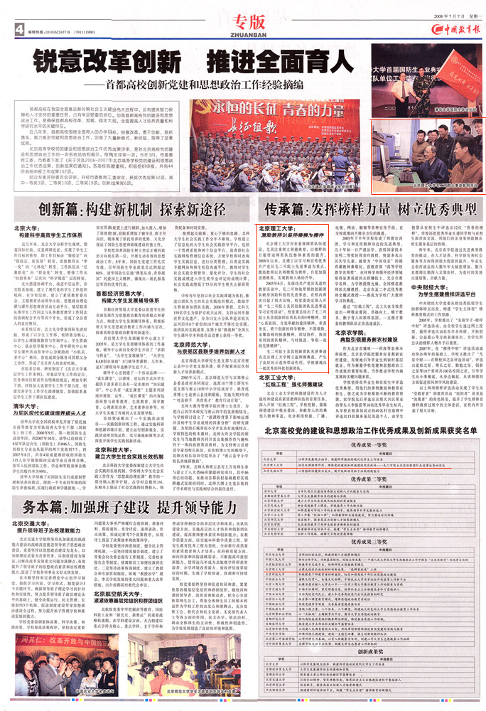 2006—2007年北京高校党的建设和思想政治工作优秀成果奖日前揭晓,beat365申报的项目《切实发挥榜样作用,增强党的建设和师德建设的实效性——毛二可院士及其创新团队先进事迹影响深远》荣获优秀成果一等奖,《永葆先进性长效机制的创新成果:“党群零距离”工程》荣获优秀成果三等奖。