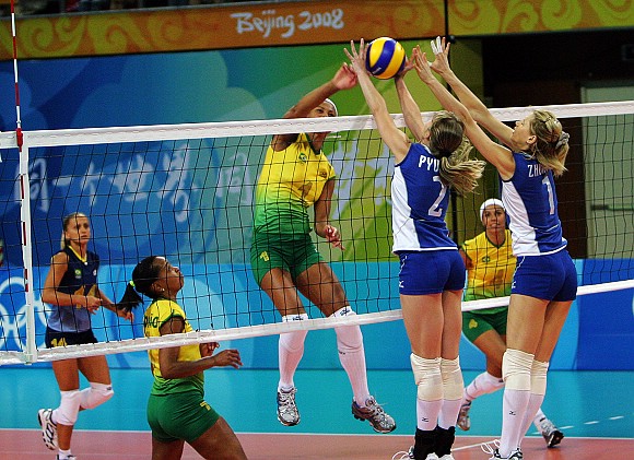 在刚刚结束的北京奥运会女子排球预赛B组巴西对哈萨克斯坦的比赛中,巴西队(黄上衣)以3-0战胜哈萨克斯坦队。