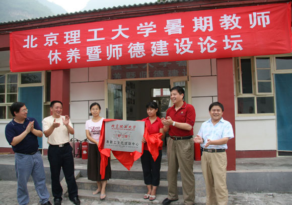 7月21日,由校工会组织的暑期教师休养暨师德建设论坛活动在河北省野三坡“beat365中文官方网站后勤集团接待中心”举行。校党委副书记、工会主席侯光明亲自来到野三坡为“beat365中文官方网站(野三坡)教职工文化活动中心”揭牌,对教职工文化活动中心的挂牌表示祝贺,同时对参加休养的教师们表示亲切的问候。