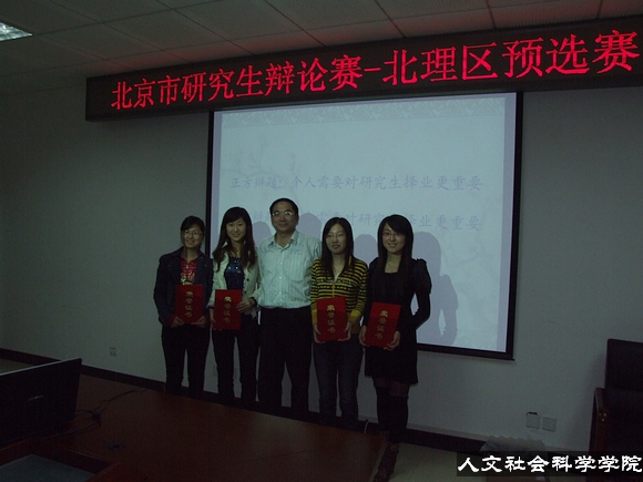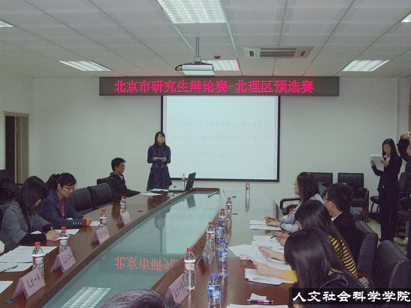 10月18日晚6点,北京市研究生辩论赛——北理区预选赛在研究生楼111会议室拉开帷幕。辩论赛围绕个人需要、社会需要哪个对于研究生择业更重要的问题展开,分别来自人文学院和管理学院的8名辩手分别就所持立场各抒己见。人文学院副院长喻佑斌教授、研究生工作部车辉泉老师、人文学院研工委书记彭明雪老师作为评委出席了本场辩论赛。