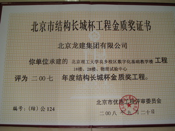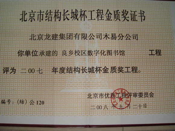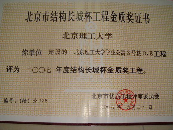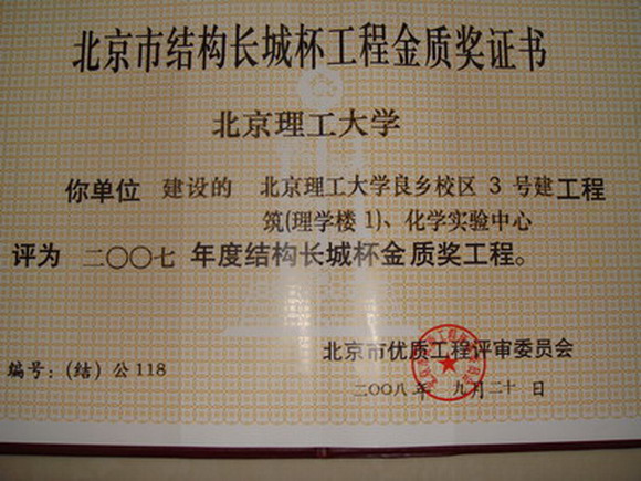 beat365中文官方网站良乡校区3号建筑(理学楼1)、化学实验中心,良乡校区3号学生公寓D、E工程,良乡校区数字化图书馆工程和良乡校区数字化基础教学楼工程、1号楼、2号楼、物理实验中心被评为2007年度北京市建筑结构长城杯工程金质奖。