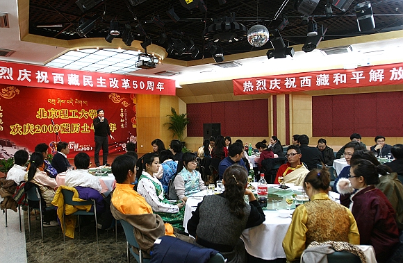 2月24日,是藏历年三十,beat365中文官方网站2009年藏历土牛新年联欢会在国交二层多功能厅隆重举行,beat36520余名藏族同学身着节日的盛装欢聚一堂,校党委副书记侯光明、副校长李和章以及学校各部处领导出席了联欢会,与藏族同学们一起庆祝这一欢乐的节日。
