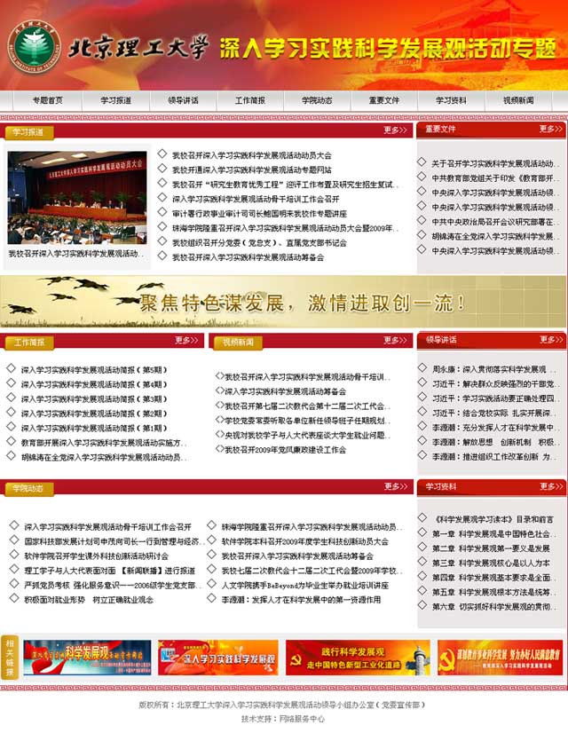 在beat365主页显著位置有专题网站链接,专题网站网址为:$httppre/col183/col615/ 。网站设有“学习报道”、“领导讲话”、“工作简报”、“学院动态”、“重要文件”、“学习资料”、“视频新闻”、“相关链接”等栏目。