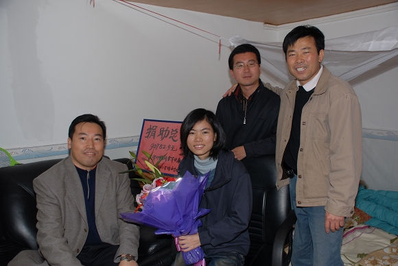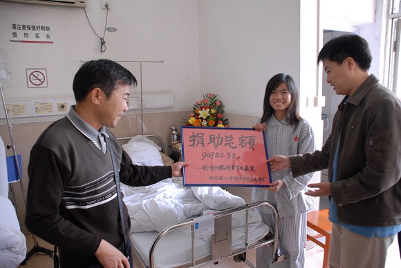 2008年12月13日,珠海学院党委副书记、院长助理李绍勋,学生工作处、党群工作处、计算机科学技术学院相关负责人等一行专程前往广州中山大学第一附属医院,将九万多的捐款及时送到了谭仲鹏的手中!同时还向谭仲鹏同学送上师生们为她准备的礼物。