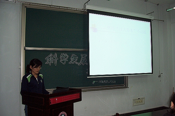 首先,由党支部入党积极分子代表郝凤霞讲述了她眼中的科学发展观。报告题为《大学生如何实践科学发展观》,她清晰而又简明扼要地阐述了大学生对于社会的重要意义,大学生成长过程中存在的普遍问题,如何应用科学发展观解决大学生中存在的问题等几方面问题,她认为,科学发展观中蕴含的世界观、方法论是指导我们学习成长的有力武器,可以使我们全面的审视自己,弥补缺陷,克服弱点,发扬优点,把自己塑造成为“具有高度的社会责任心、过硬的社会竞争力以及国际竞争力、个性与人格得到健全发展的高素质创新人才”。