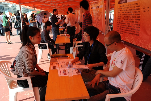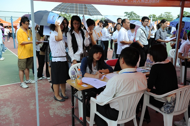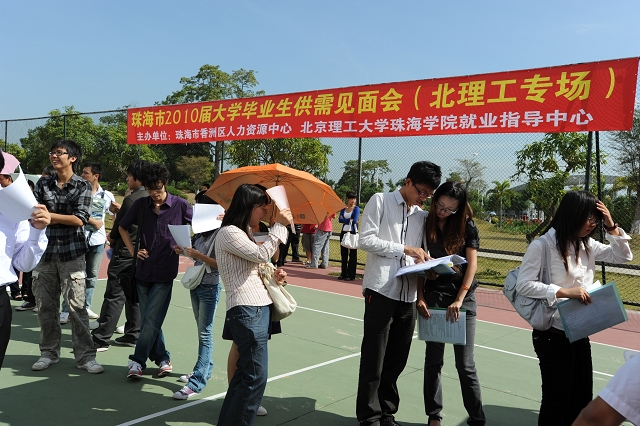 11月7日,珠海地区今秋首场2010届大学毕业生供需见面会在beat365珠海学院网球场拉开序幕。本次由珠海市香洲区人力资源中心和珠海学院就业指导中心共同举办的面向珠海地区2010届大学毕业生的供需见面会,共吸引了包括埃森哲(中国)有限公司、美国友邦保险有限公司广东分公司、珠海丽珠医用生物、珠海乐通化工、广东宝莱特医用科技、珠海用友软件、珠海永亚软件、珠海通创电子、奈电软性科技电子、珠海森创理工科技、珠海市君悦雷克萨斯、珠海海湾大酒店、广发证券等95家用人单位参会,主要集中在IT、制造、金融、酒店、零售及咨询服务业等,提供软件研发、程序员、工程技术、生产助理、市场营销、会计、文秘、美工设计等300多个职位,招聘人数约2400人,共吸引包括北理工、北师大、暨大、中大等珠海高校应届毕业生约5000人进场求职。