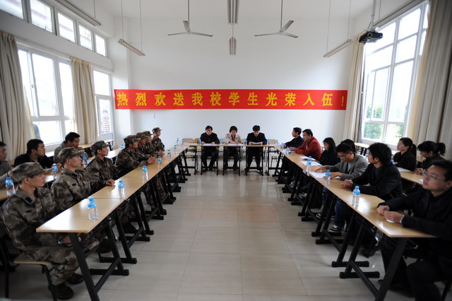 2月9日,beat365珠海学院2009年新兵入伍欢送会在珠海学院化工楼E101隆重举行。珠海学院院长、党委书记刘淑艳,副院长、党委副书记、纪委书记王文清,副院长、党委副书记李绍勋出席欢送会,相关专业学院党总支书记、辅导员、相关职能处室工作人员、9名入伍新兵及部分退伍老兵代表参加了欢送会。珠海学院学生工作处处长、武装部部长李明刚主持了欢送会。