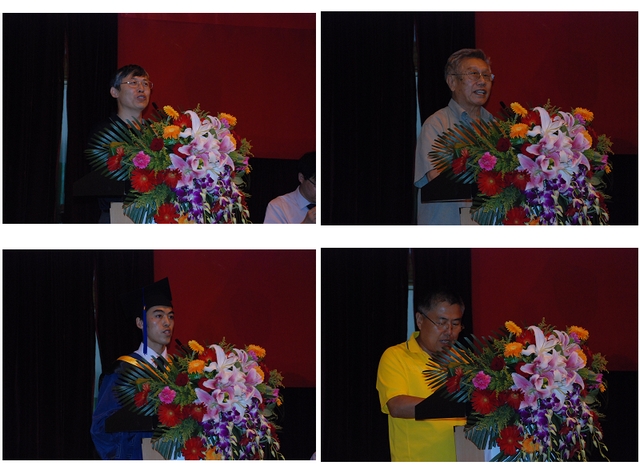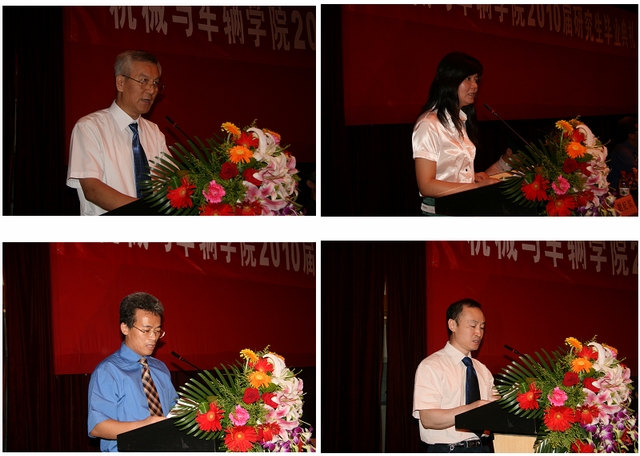 车辆工程系主任苑士华教授(左上)作为教师代表发言,苑教授对同学们圆满完成学业表示祝贺,希望同学们在今后的生活工作中脚踏实地,锲而不舍,开拓创新,不断进步,为自己定下的人生道路而不懈奋斗。老校友张均享(右上)发表感言,希望大家好好珍惜这两年,不要把这两年时光荒废掉,希望学弟、学妹们充分发扬北理工的光荣传统,毕业后能做出自己应有的贡献!学生代表曾宇同学(左下)代表全体2010届毕业研究生发言,感谢导师的悉心指导和学院的提供良好的科研环境,同时也表示将牢记母校的教导,继续不断地努力,踏踏实实做人,勤勤恳恳做事。家长代表朱元生(右下)向学校、学院的老师们表达了感谢之情,代表家长嘱咐毕业生,在今后的道路上做个诚实守信、胸怀宽广、理想远大、热爱祖国的人。