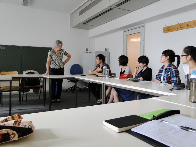 这次的游学活动为期一个月,主要内容为课程研修、企业调研和文化经典考察。每周四天课程,内容涉猎德国历史、社会与文化,每天处理一个主题,如柏林印象、柏林方言、德国幽默、幸福观、艺术观、环保、语言、外国人、分裂历史等等。很多主题同学们在国内或多或少地都有些了解,最令大家感到骄傲的就是在国内学过的东西在国情方面和交流中都发挥了作用,授课教师常常惊叹外国学生能拥有这么多的德国国情和德语知识。德语课堂既印证并温习了很多同学们已经学过的知识,同时也为大家提供了很多不一样的视角和思考方式,在许多问题上使大家深受启发。