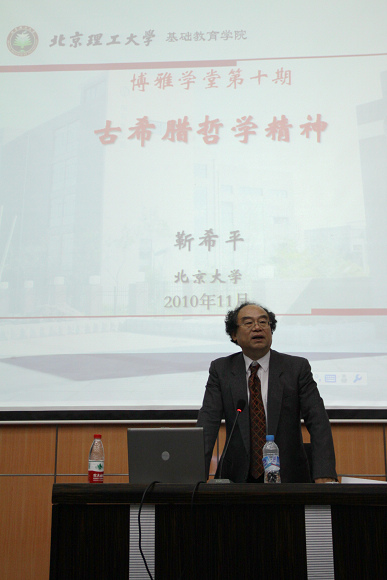 2010年11月18日晚,博雅学堂第十期主题《古希腊哲学精神》在良乡校区报告厅精彩上演。本期嘉宾邀请到中国现象学学会主席、北京大学外国哲学研究所所长、北京大学希腊研究中心副主任、博士生导师靳希平教授。