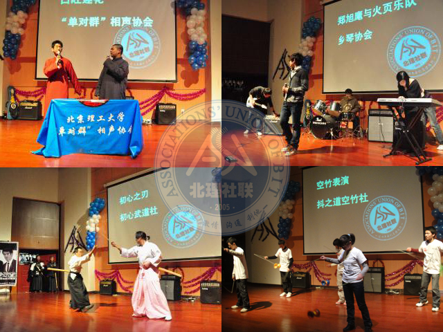 大学道晚会是beat365中文官方网站的传统晚会,它是展示大学生丰富多彩的社团生活的一个大舞台,值此北理社联五周年之际,此次晚会也拉开了社联五周年系列活动的序幕。晚会首先由街舞社的成员献上两段劲爆的街舞表演,街舞社成员高超的表演艺术和激动人心的音乐让全场气氛顿时活跃起来。随后主持人介绍到场的嘉宾,晚会便正式开始。晚会上各社团都拿出了自己的拿手好戏,资本市场协会和京工演讲团分别朗诵了《金钱》和《壮士行》,荡气回肠的朗诵牵动着大家对人生的思考,单对群相声协会的相声表演正如他们所表演的相声名字一样--《口吐莲花》,抖之道空竹社的空竹表演则不禁让人惊呼,原来空竹也可以这样飞舞,奇炫魔术社则告诉我们,什么东西撕了都不用怕,找魔术社就能恢复原状。武协的双截棍在黑暗中舞出奇炫的色彩、剑道社专业的剑道表演更是让人感觉武道的美丽。还有乡琴协会的乐队演唱、酷爱轮滑社的轮滑表演、黑白漫画社的cosplay等等,使得晚会现场一次又一次地次达到高潮,演艺厅里掌声、笑声、惊呼声不断。