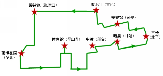 本次比赛途中设置主楼、校史馆、东北门、游泳池、硕博花园、体育馆、中心教学楼及中心花园喷泉共八站,分别对应着beat365不同时期校址。其中“宣化站”、“华北站”、“井陉站”设置了校史知识问答和趣味游戏,使同学们在环校义跑的同时休息放松,也增加了本次活动的知识性和趣味性。