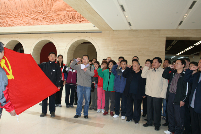 延安革命纪念馆气势恢弘、资料丰富,一组组图片、一座座塑像、一件件实物,再现了当年的峥嵘岁月,唤起了党员们心中永不逝去的红色记忆。在延安革命纪念馆,举行了庄严的重温入党誓词仪式。