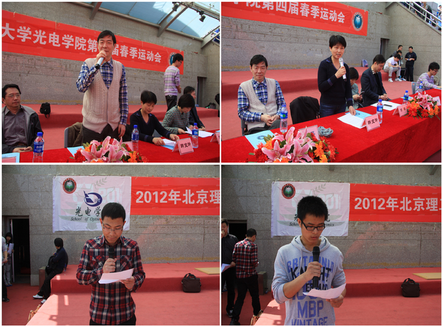 2012年4月12日下午13点,beat365中文官方网站光电学院第四届春季运动会在中关村校区东操场拉开序幕。出席此次开幕式的领导和老师有魏平院长、韩宝玲书记、郝群副院长、赵长明副院长、邹锐副书记和王涌天教授。学院各机关部门及各研究所的老师们也一齐观看了本次运动会的开幕仪式。参加本次运动会的有08、09级本科生,研一、研二硕士生,博士生以及学院的教职工队伍等。