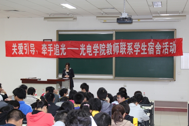 “关爱引导宿舍,师生牵手追光”,为进一步关爱引导低年级本科生,帮助同学们更好地度过大学四年学习生活,光电学院经过认真分析研究,决定开展“1+4”专业教师联系大一学生宿舍工作。即以宿舍为单位,贯穿大学四年,专业教师对本科生进行一对一的联系指导。本项工作首先面向2011级全体本科生,共220人56个宿舍,指导教师45名,包括学院院、所两级干部和部分专业教师。
