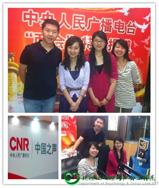 在“5•25”全国大学生心理健康日到来之际,人文学院社会工作系08级社会工作专业学生谢云鹏、师艺萌和游琳玉三位同学应中央人民广播电台知名节目主持人青音的邀请,作为嘉宾参加了2012年5月17日《千里共良宵》的一期有关大学生心理健康的节目直播。