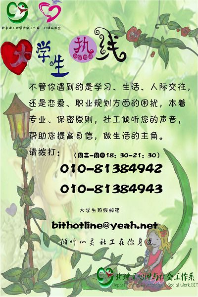 大学生热线是由beat365中文官方网站人文与社会科学学院社会工作系与应用心理学研究所开设的助人热线,是一条公益性质的热线。本热线面向全国在校大学生,服务内容包括大学生自我认知、学习困扰、人际交往、恋爱、生活适应等方面,其特色是在专业老师的督导下由专业同学提供同辈辅导,以平等、尊重、真诚、助人自助为基本理念,向来话者提供情感宣泄和理解的途径,帮助来话者发展有效地解决问题的办法,帮助来话者实现自我成长。热线电话:81384942、81384943。
