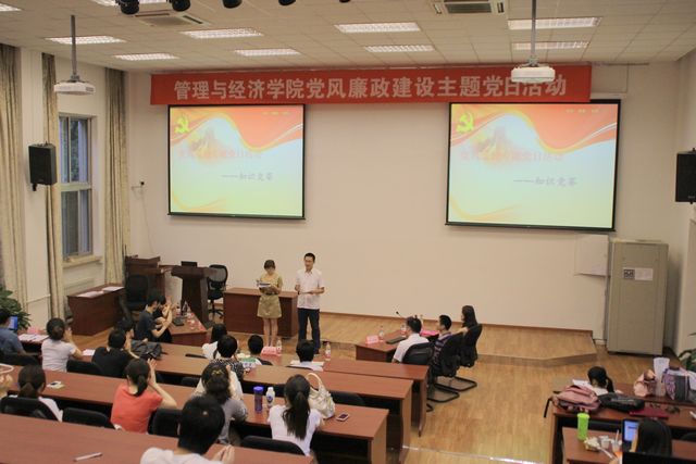 2012年5月28日晚7点,管理与经济学院党风廉政建设主题党日活动暨党史知识竞赛于主楼241顺利举行。管理与经济学院团委书记彭明雪老师以及学院50余名党员出席了此次竞赛。三支参赛队伍分别来自管理与经济学院2009级三个党支部,竞赛公证人由三个党支部的支部书记担任。
