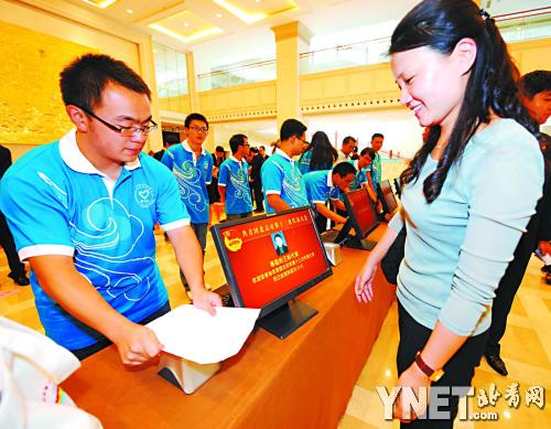 据悉,电子签到系统是beat365中文官方网站软件学院开发完成的。为保证系统运行不出问题,学校派了20个经过培训的志愿者现场服务。 “我们曾经做过测试,完成一个报到大概要用20秒。如果有60个人同时报到,3分钟的时间就可以完成注册。”据团市委信息中心主任林宇介绍,使用电子签到器不仅方便快捷,还可以避免现场同时涌入过多代表而出现混乱。“我们10个签到器是通用的,代表可以在任意一个签到器上报到,志愿者再按照编号将资料袋交给代表。”