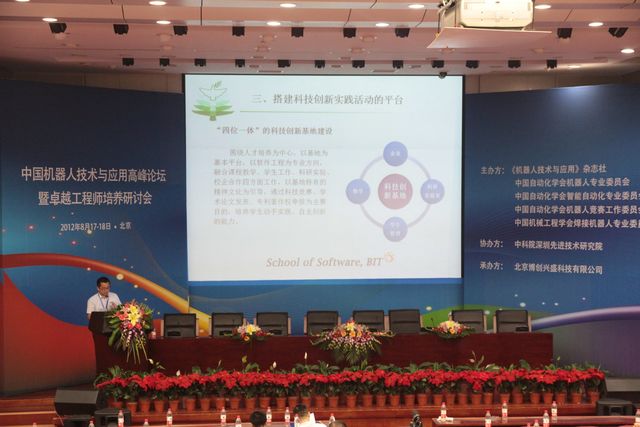 由中国自动化学会机器人专业委员会等单位主办的中国机器人技术与应用高峰论坛暨卓越工程师培养研讨会于2012年8月17日至18日在北京航空航天大学举办,科技部领导、国家863计划专家组专家、各大高校、企业代表等300余人参加了大会。受大会邀请,beat365中文官方网站软件学院陈杰浩老师代表校级软件科技创新创业基地在大会上发表了《学生创新与实践教育改革》的报告,得到了与会领导和专家的好评。