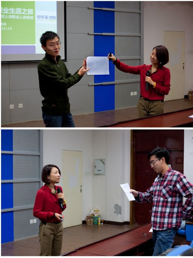 活动由“开启你的职业生涯之旅”和“职业化ABCD”及“专家指导”三个部分构成。在活动开始前,施老师与同学们进行了互动,让同学们描绘一幅“人生旅图”,并请了3名同学到台上对自己的图进行讲解。每一位同学都很认真细致,仔细地说明了自己的规划。接下来施老师通过引用热播剧《北京青年》,切入了今天的主题。